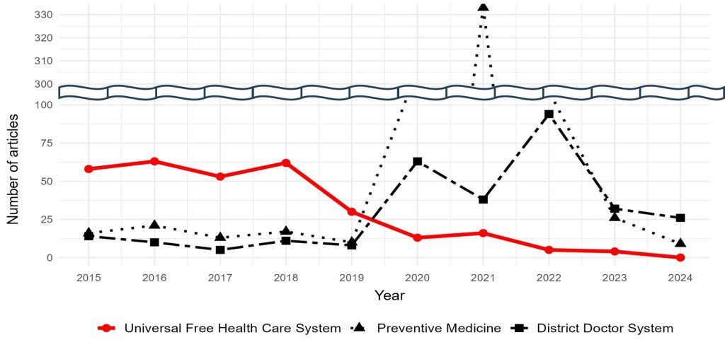 A quantitative text analysis of articles in Rodong Sinmun regarding the three traditional pillars of North Korean healthcare—”Universal Free Healthcare System,” “Preventive Medicine,” and the “District Doctor System”—reveals a stark trend. As shown in Figure 1, the number of articles referencing the UFHCS remained relatively stable from 2015 through 2018, ranging from 53 to 63 per year. However, a decline began in 2019 (30 articles) and accelerated during the pandemic: only 13 articles appeared in 2020, dropping to just five in 2022. By 2024, the phrase had vanished completely. This pattern stands in stark contrast to the trends for the other two pillars of North Korean healthcare—the “District Doctor System” and “Preventive Medicine.” Coverage of these topics surged during the COVID-19 pandemic (2020–2022) and has remained steady since 2023.